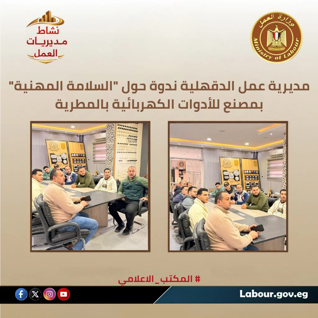 ونظمت مديرية عمل الدقهلية، من خلال مكتب السلامة "بالمطرية"، ندوة توعوية بمصنع "الوسام للأدوات الكهربائية"، بمشاركة 18 من العاملين وأعضاء لجان السلامة بالمنشأة.