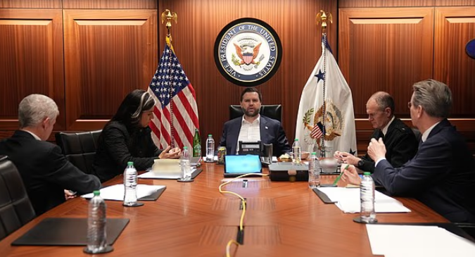 تُظهر صورة أخرى نائب الرئيس جيه دي فانس إلى جانب كبار المسؤولين في غرفة عمليات مارالاجو، بما في ذلك مديرة المخابرات الوطنية تولسي غابارد.