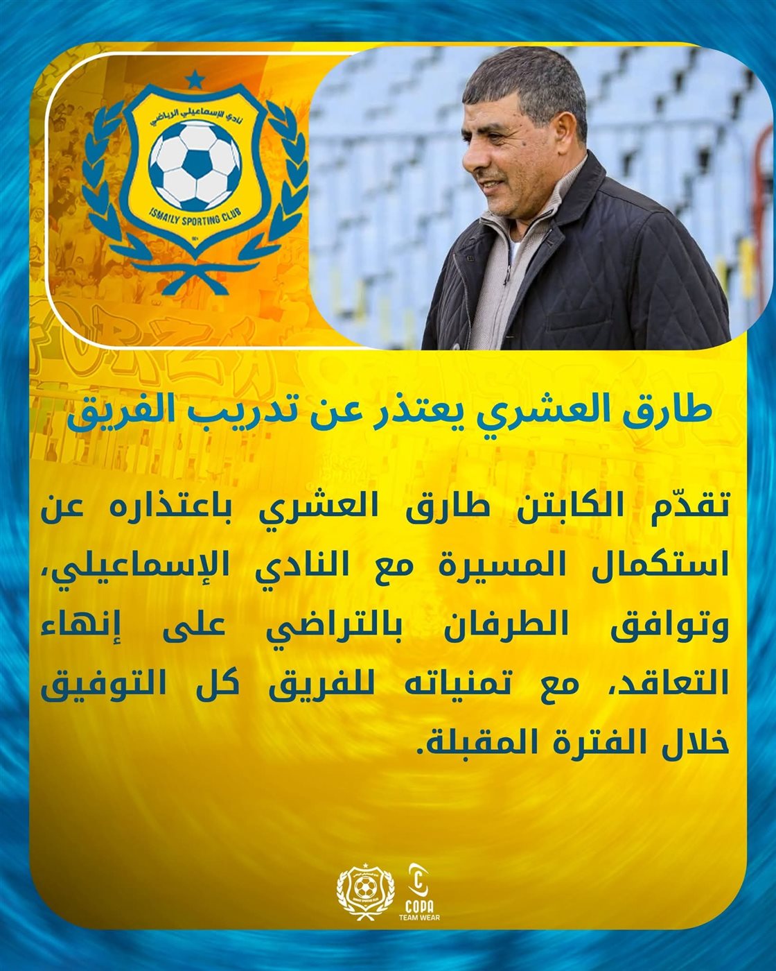 تقدم طارق العشري باعتذاره عن عدم استكمال مهمته مع النادي الإسماعيلي خلال الفترة المقبلة، وذلك بعد اتفاق الطرفين بالتراضي على إنهاء التعاقد بينهما.