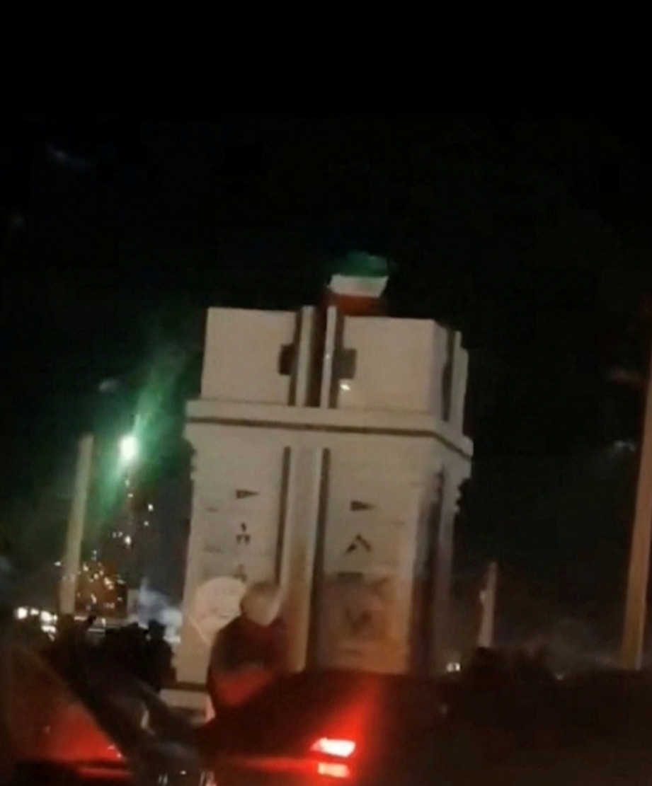 وفي الصورة أعلاه العلم الإيراني القديم، الذي كان سائداً قبل الثورة الإسلامية عام 1979، وهو يُرفرف بينما تنطلق الألعاب النارية احتفالاً بوفاة خامنئي، وقد وقع هذا المشهد في مدينة إيزه.