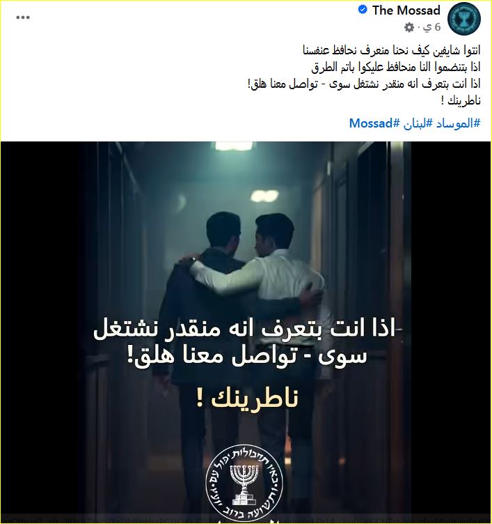 شهدت الأيام الماضية تفاعلاً واسعًا بعد تداول محتوى صادر عن صفحة موثقة على موقع التواصل الاجتماعي “فيسبوك” تحمل اسم THE Mossad، نشرت مقاطع فيديو ومنشورات تدعو أشخاصًا من مختلف دول العالم إلى التعاون والعمل مع جهاز الاستخبارات الإسرائيلي “الموساد”، مقابل ما وصفته بـ"مزايا لا تُعد ولا تُحصى".