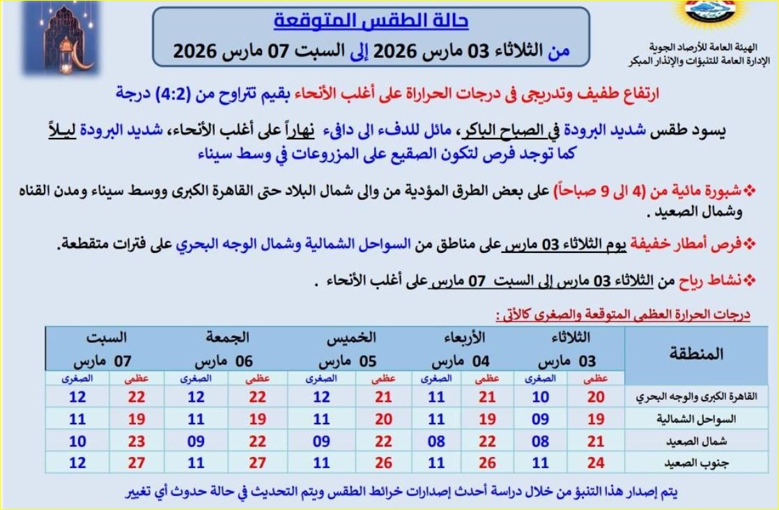 أعلنت الهيئة العامة للأرصاد الجوية حالة الطقس المتوقعة خلال الفترة من الثلاثاء 3 مارس حتى السبت 7 مارس 2026، مشيرةً إلى ارتفاع طفيف وتدريجي في درجات الحرارة على أغلب الأنحاء بقيم تتراوح بين درجتين وأربع درجات.