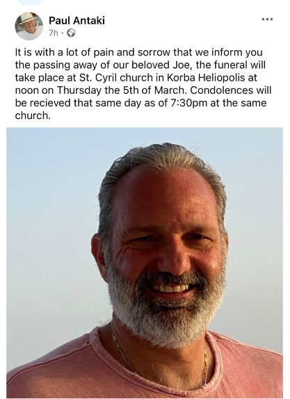 وكتب بول أنطاكي شقيق يوسف عبر فيس بوك: “ببالغ الحزن والأسى، ننعى إليكم وفاة فقيدنا جو، ويقام العزاء في كنيسة القديس كيرلس في كوربا هليوبوليس ظهر يوم الخميس الموافق 5 مارس”.