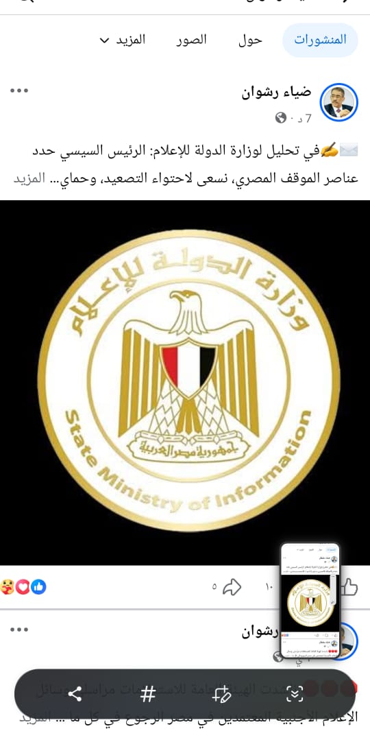 قالت وزارة الدولة للإعلام إنه في ظل متابعة مجريات الأزمة الإقليمية الجارية حاليًا والموقف المصري الرسمي منها، نؤكد على العناصر الرئيسة لهذا الموقف، الذي عبر عنه السيد الرئيس عبدالفتاح السيسي، رئيس الجمهورية، القائد الأعلى للقوات المسلحة، في كلمته بحفل الإفطار السنوي الذي أقامته القوات المسلحة تزامنًا مع الاحتفال بذكرى انتصارات العاشر من رمضان.