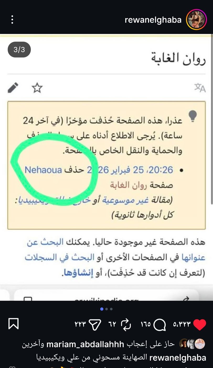 أعلنت الفنانة روان الغابة عن حذف صفحتها التعريفية من موسوعة ويكيبيديا، مشيرةً إلى أن ما حدث جاء من قبل نشطاء إسرائيليين، وذلك عبر حسابها الرسمي على موقع تبادل الصور والفيديوهات الأشهر إنستجرام.