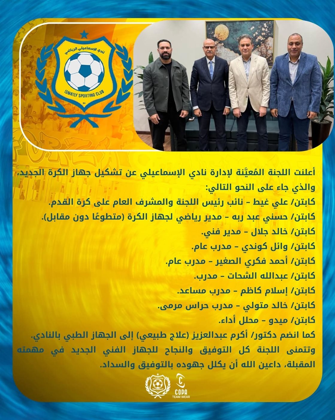 وأعلن نادي الإسماعيلي عن تشكيل الجهاز الفني والمعاون للدروايش، والذي جاء كالتالي: