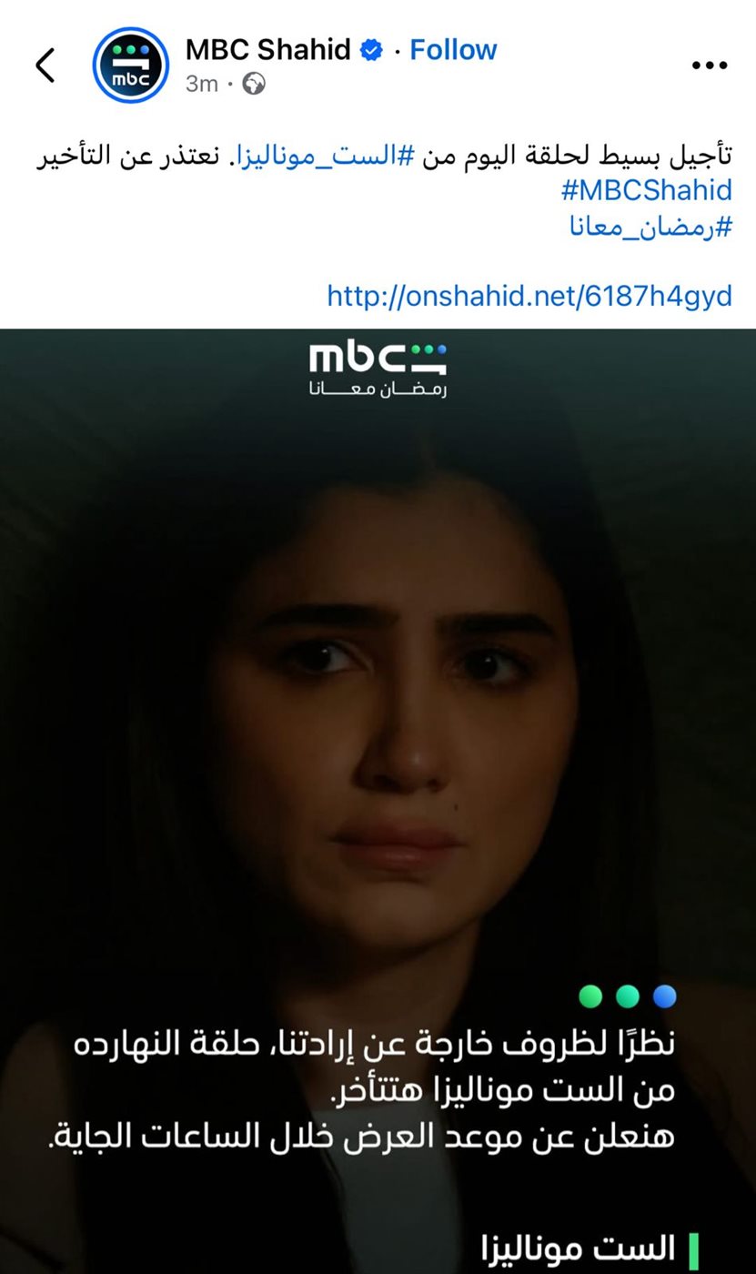“نظرًا لظروف خارجة عن إرادتنا، حلقة النهارده من الست موناليزا هتتأخر، وهنعلن عن موعد العرض خلال الساعات الجاية”، ما أثار حالة من الترقب بين جمهور العمل على مواقع التواصل الاجتماعي.