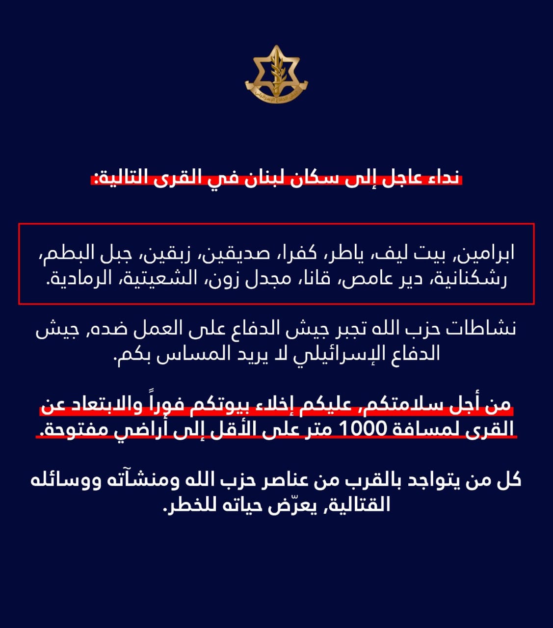 وقال المتحدث باسم جيش الاحتلال الإسرائيلي أفيخاي أدرعي عبر حسابه على تويتر: عاجل انذار عاجل إلى سكان لبنان وتحديدًا في القرى المعروضة أسمائها: البرامين ،بيت ليف ،ياطر ،كفرا ،صديقين ، زبقين ، جبل البطم ، رشكنانية، دير عامص ، قانا ، مجدل زون ، الشعيتية الرمادية، أنشطة حزب الله تجبر جيش الدفاع على العمل ضده بقوة ولا ننوي المساس بكم.