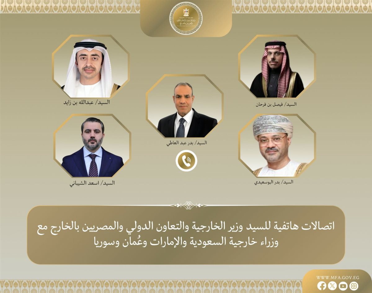 فى إطار متابعة التطورات المتلاحقة فى المنطقة، جرت سلسلة اتصالات هاتفية بين د. بدر عبد العاطي وزير الخارجية والتعاون الدولي والمصريين بالخارج، وكل من الأمير فيصل بن فرحان وزير خارجية المملكة العربية السعودية، وسمو الشيخ عبد الله بن زايد نائب رئيس مجلس الوزراء ووزير خارجية دولة الإمارات العربية المتحدة، والسيد بدر بن حمد البوسعيدي وزير خارجية سلطنة عمان، والسيد أسعد الشيباني وزير خارجية الجمهورية العربية السورية.