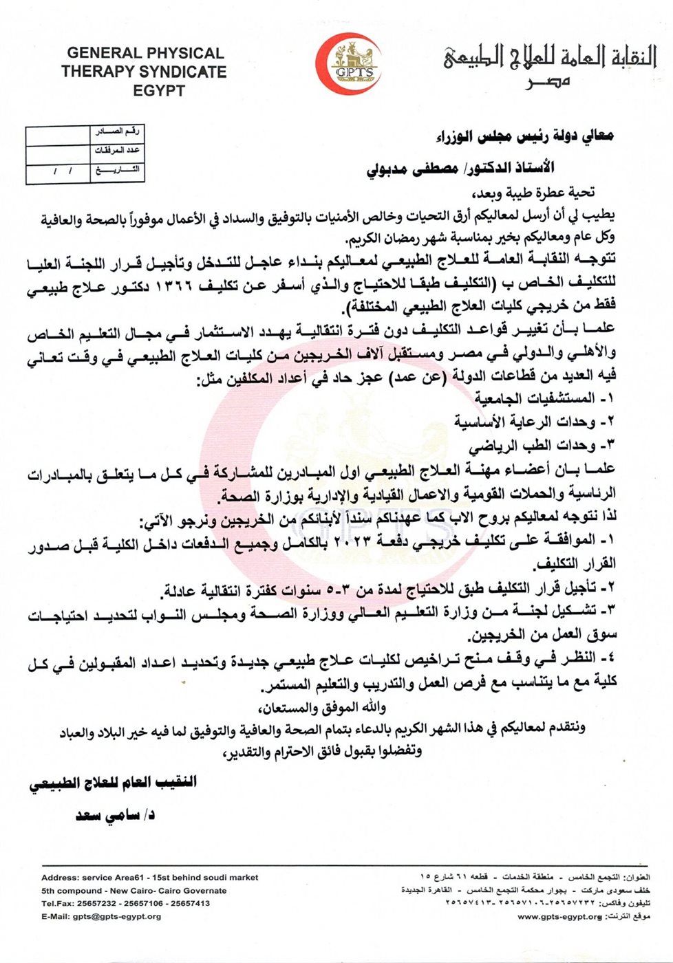 عاجل.. نقيب العلاج الطبيعي يخاطب رئيس الوزراء بشأن تكليف الخريجين دفعة 2023
