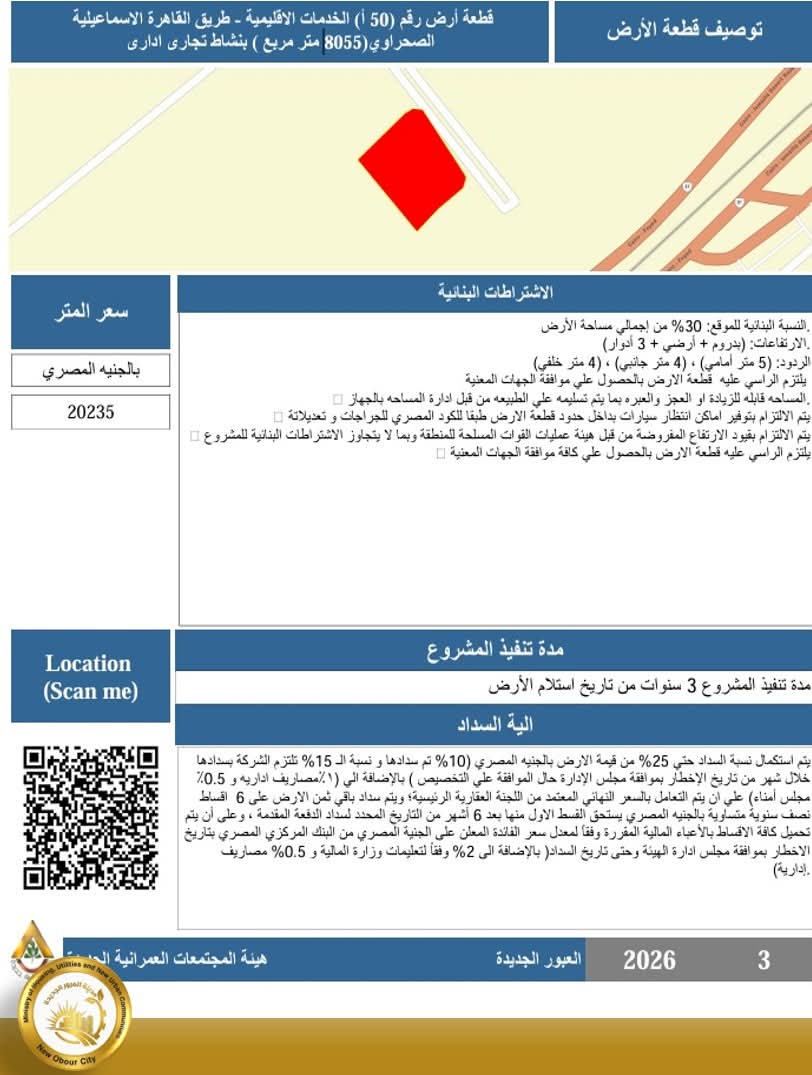 1 - قطعة الأرض رقم (50 أ ) – منطقة الخدمات الإقليمية – طريق القاهرة الإسماعيلية الصحراوي.