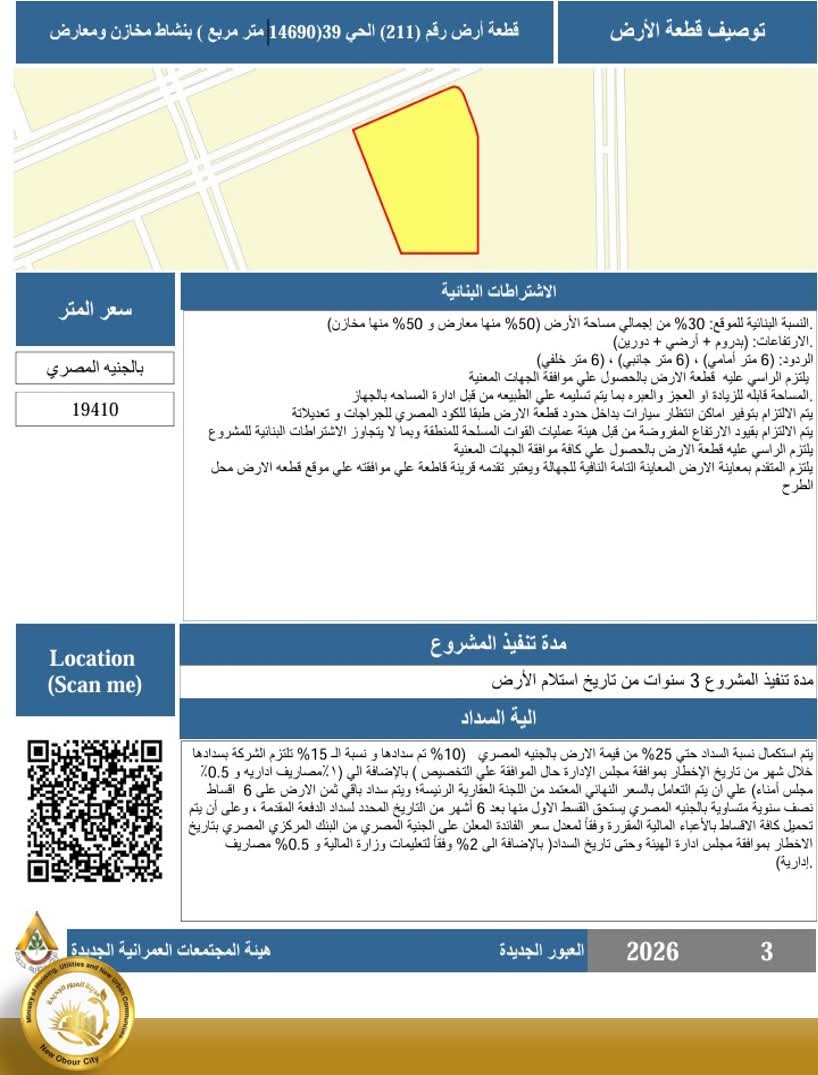 وأوضح مراد، أن الفرص المطروحة تشمل أراضيَ استثمارية متنوعة المواقع والاستخدامات، موزعة بين أنشطة تجارية، إدارية، ومخازن، وذلك في إطار رؤية متكاملة لتوسيع القاعدة الخدمية والاقتصادية بمدينة العبور الجديدة، وتعزيز مكانتها كوجهة استثمارية رائدة في المنطقة الشرقية من القاهرة الكبرى.