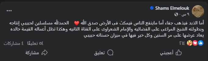 وكتبت عبر حسابها الشخصي على موقع «فيس بوك»:«أما الزبد فيذهب جفاء وأما ما ينفع الناس فيمكث في الأرض.. الحمد لله يُعاد عرض مسلسلين من إنتاج وبطولة حبيبي، الشيخ المراغي على إحدى القنوات الفضائية والإمام الشعراوي على القناة الثانية، وهكذا تظل أعماله الطيبة باقية عبر السنين، وكل ما فيها من خير في ميزان حسناته بإذن الله».