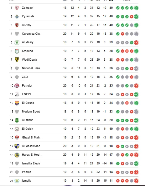 ويتصدر الزمالك جدول الترتيب برصيد 40 نقطة ويتفوق بفارق الأهداف على بيراميدز صاحب المركز الثاني بنفس عدد النقاط، ويتقدم على الأهلي صاحب المركز الثالث بنفس عدد النقاط.