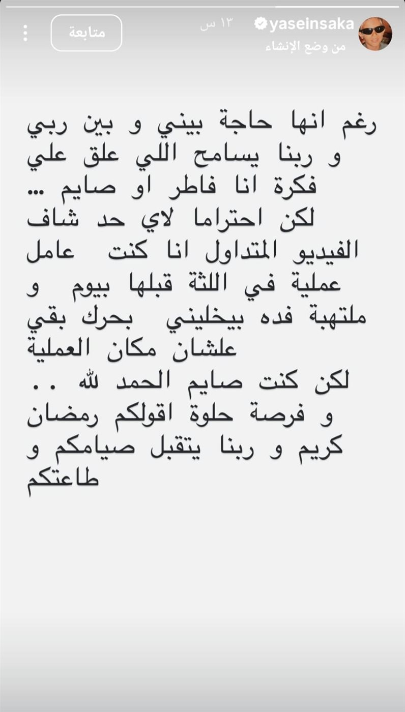 ورد ياسين أحمد السقا على هذه التعليقات عبر خاصية “ستوري” على حسابه الرسمي على موقع تبادل الصور والفيديوهات الأشهر انستجرام، مؤكدًا أنه كان صائمًا بالفعل.