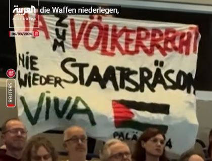 ومصطلح Staatsräson (مصلحة الدولة العليا) يُستخدم في السياق الألماني للإشارة إلى التزام ألمانيا التاريخي والسياسي تجاه أمن إسرائيل، والمتظاهرون هنا يطالبون بتقديم القانون الدولي على هذه الحسابات السياسية.