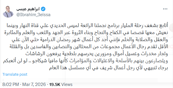 وكتب إبراهيم عيسى عبر حسابه على منصة إكس أن دراما رمضان 2026 تُظهر رجال الأعمال بصورة سلبية مبالغ فيها، حيث يتم تصويرهم على أنهم مجموعة من المحتالين والنصابين والفاسدين، إلى جانب تورطهم في جرائم مثل تجارة المخدرات وغسل الأموال والتزوير.