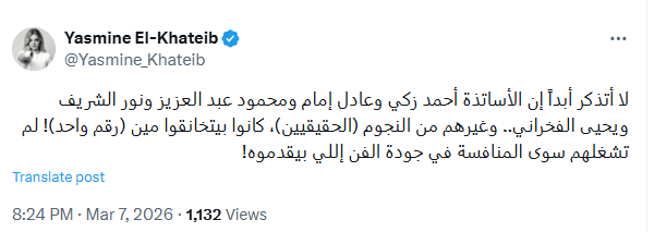 وكتبت ياسمين الخطيب في منشورها:"لا أتذكر أبداً إن الأساتذة أحمد زكي وعادل إمام ومحمود عبد العزيز ونور الشريف ويحيى الفخراني.. وغيرهم من النجوم (الحقيقيين)، كانوا بيتخانقوا مين (رقم واحد)! لم تشغلهم سوى المنافسة في جودة الفن اللي بيقدموه!".