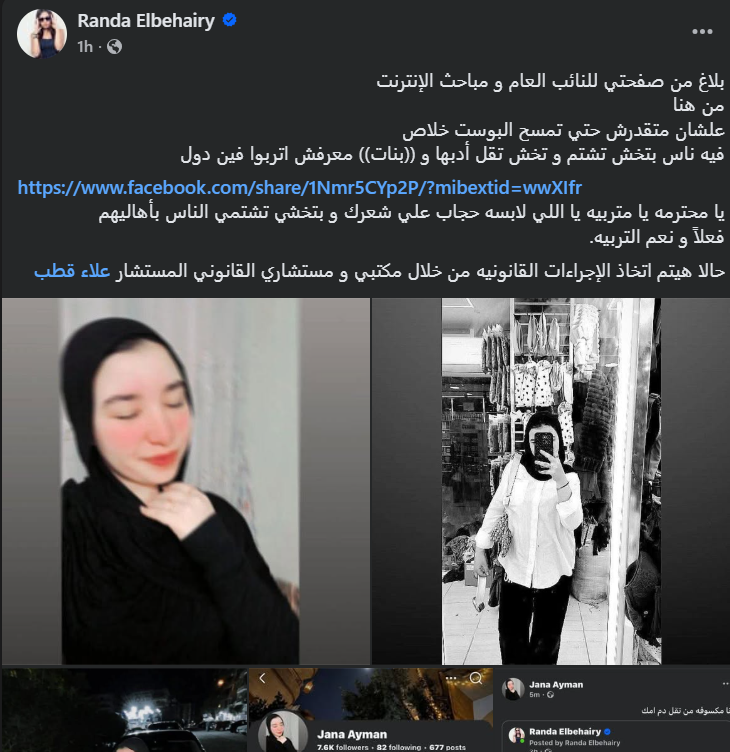 نشرت راندا البحيري مجموعة صور توثق تعرضها للسب والقذف من قبل هذه الفتاة، مع نشر صور لها ولحسابها الشخصي على فيسبوك، وأرفقتهم بتعليق قائلة: “بلاغ من صفحتي للنائب العام و مباحث الإنترنت من هنا علشان متقدرش حتي تمسح البوست خلاص”.