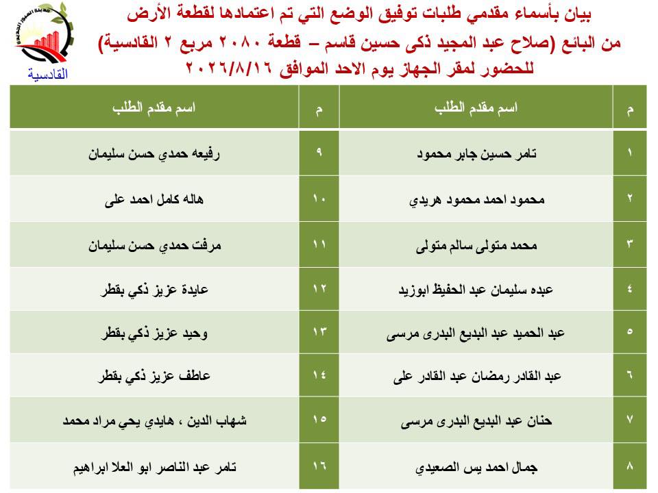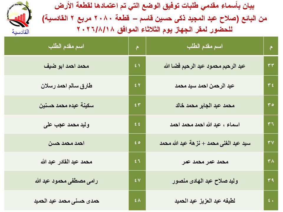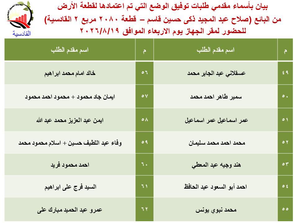وجاءت أسماء المواطنين المعلن عنها لاستكمال اجراءات توفيق أوضاعهم في منطقة القادسية سابقا كما هو موضح في الصور التالية..