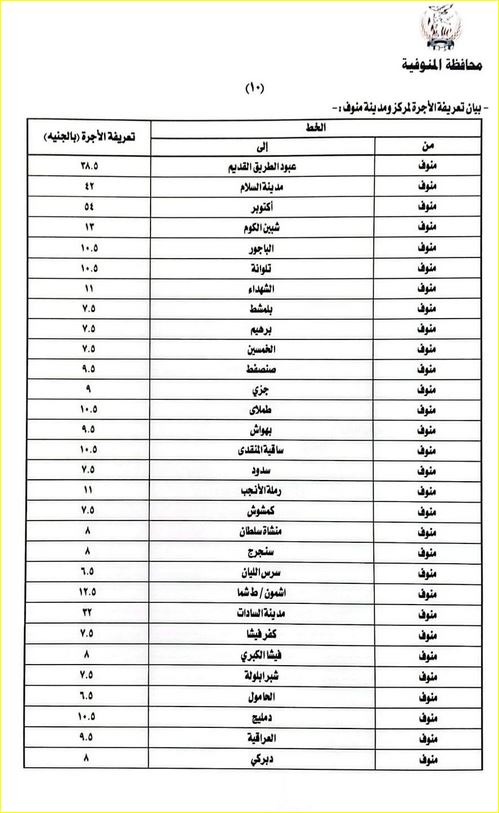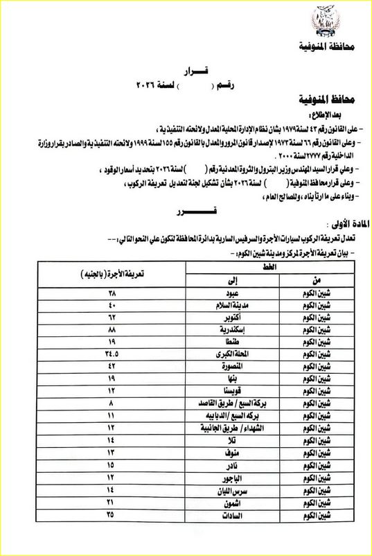 أصدر اللواء عمرو الغريب، محافظ المنوفية، قرارا بشأن تعديل التعريفة الجديدة والمقررة لركوب سيارات الأجرة والسرفيس والتاكسي والتوك توك بدائرة المحافظة، وذلك عقب قرار لجنة التسعير التلقائي للمنتجات البترولية وزيادة أسعار البنزين والسولار بوزارة البترول والثروة المعدنية وفي ظل الظروف الاستثنائية التي تمر بها أسواق الطاقة العالمية اعتبارا من اليوم الثلاثاء الموافق ١٠ مارس٢٠٢٦.