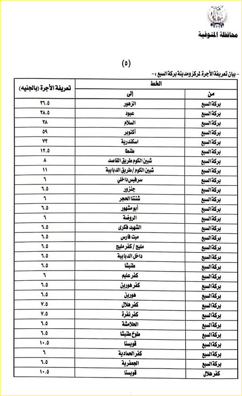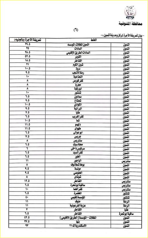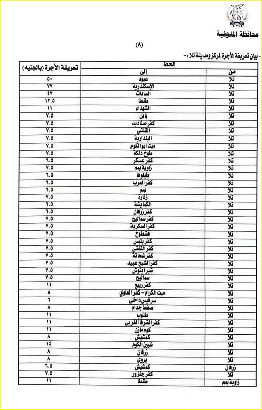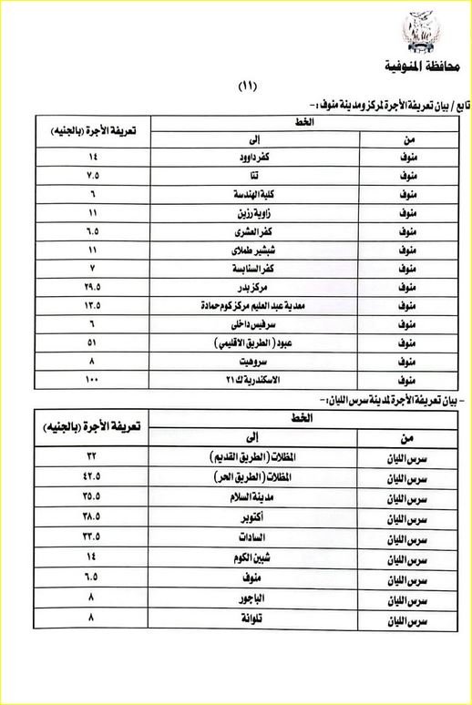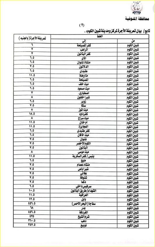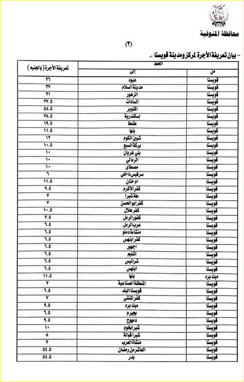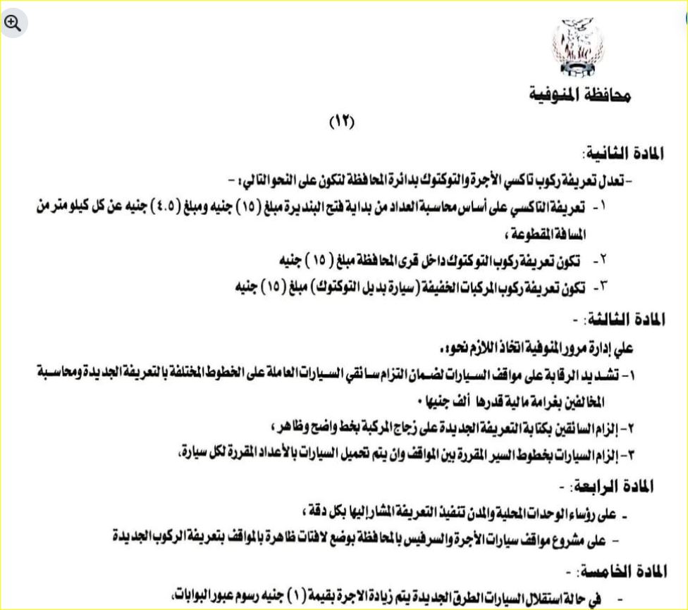 وتضمنت المادة الثانية من القرار تعديل تعريفة ركوب التاكسي على أساس محاسبة العداد من بداية فتح البنديرة بمبلغ (١٥) جنية ومبلغ (٤.٥٠) جنيه عن كل 1 كيلو متر من المسافة المقطوعة، و(١٥) جنيهًا تعريفة الركوب الجديدة لمركبات التوكتوك والسيارة بديل التوكتوك داخل قري المحافظة والسرفيس داخل مدينة شبين الكوم ٦.٥٠ ج ، على أن تكون اسطوانة البوتاجاز المنزلي من ٢٢٥ جنيه الاسطوانه الي ٢٧٥ ، أسطوانة البوتاجاز التجاري من ٤٥٠ إلي ٥٥٠ جنيه للاسطوانة .