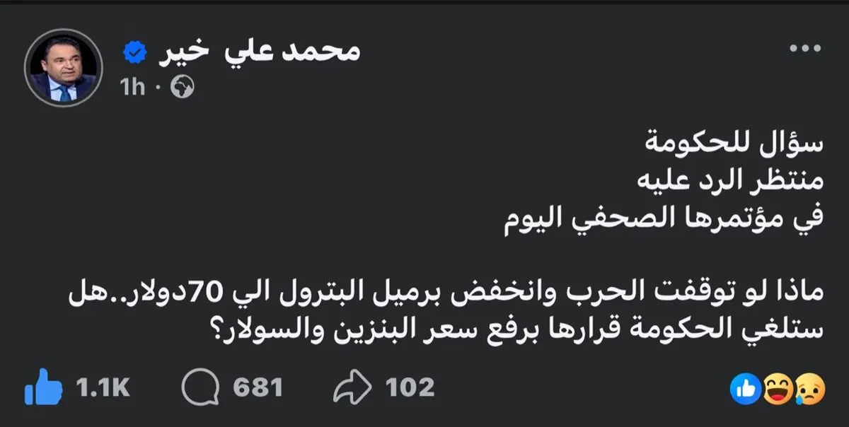 قال محمد علي خير: “سؤال للحكومة .. منتظر الرد عليه في مؤتمرها الصحفي اليوم … ماذا لو توقفت الحرب وانخفض برميل البترول الي 70دولار..”، متابعًا: “هل ستلغي الحكومة قرارها برفع سعر البنزين والسولار؟”.