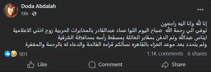 وفي السياق ذاته، نعت إيمان شقيقة الإعلامية إيناس عبد الله، الراحل، خلال منشور عبر حسابها الشخصي بموقع فيسبوك قائلة: “إنا لله وإنا إليه راجعون، توفي صباح اليوم زوج شقيقتي الإعلامية إيناس عبد الله، وجرى الدفن بمقابر العائلة بمسقط رأسه في محافظة الشرقية، ولم يتحدد بعد موعد العزاء في القاهرة، نسألكم قراءة الفاتحة والدعاء”.