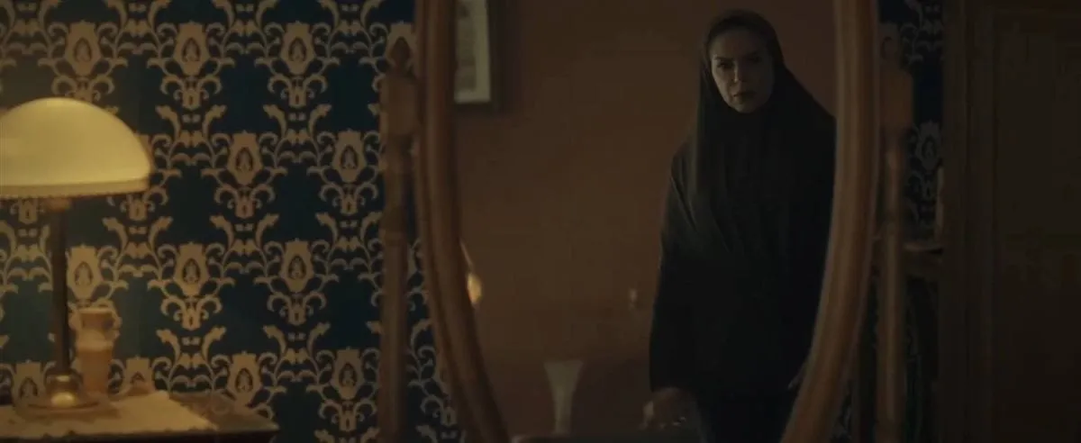 هنا يطلب منها صابر أن تتأكد بنفسها من الحقيقة، فيطلب منها النظر إلى الطفل في المرآة، تقترب منال ببطء وهي تحمل الطفل، وتنظر إلى انعكاسهما، لتكتشف مفاجأة مرعبة؛ إذ يظهر انعكاسها في المرآة بينما لا يظهر للطفل أي انعكاس على الإطلاق.