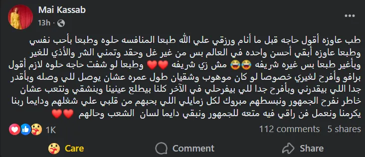 حرصت الفنانة مي كساب على توجيه رسالة صادقة إلى جمهورها وزملائها في الوسط الفني، وذلك من خلال منشور عبر حسابها الشخصي بموقع التواصل الإجتماعي الأشهر "فيسبوك"، تحدثت خلاله عن المنافسة الفنية وأهمية دعم النجاحات دون غل أو حقد.
