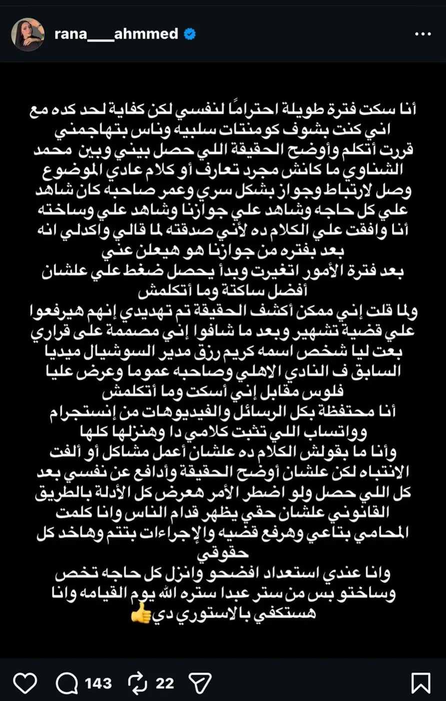 قالت رنا: “أنا سكت فترة طويلة احتراما لنفسي لكن كفاية لحد كده مع اني كنت بشوف كومنتات سلبية وناس بتهاجمني … قررت أتكلم وأوضح الحقيقة”.