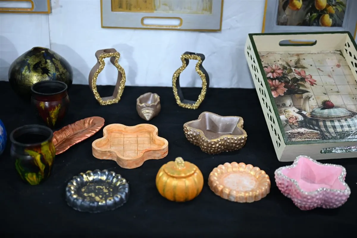 قشرة الخشب، أعمال الريزن، الكونكريت، الرسم على الفخار، والطرق على النحاس، والصدف، والخزف، وفوانيس من الخرز الملون، إلى جانب عدد من عرائس الماريونت التي لاقت إعجاب الحضور.