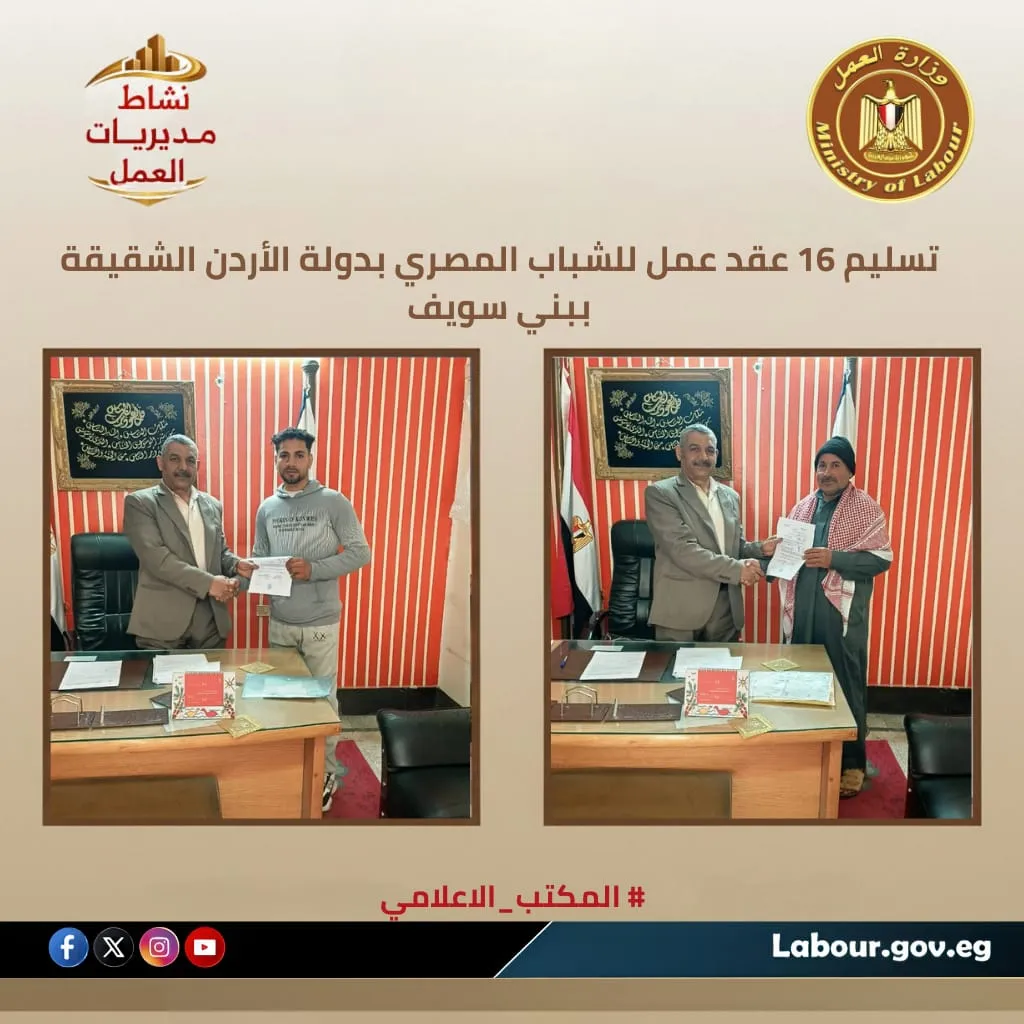 تسليم 16 عقد عمل للشباب المصري بدولة الأردن الشقيقة ببني سويف