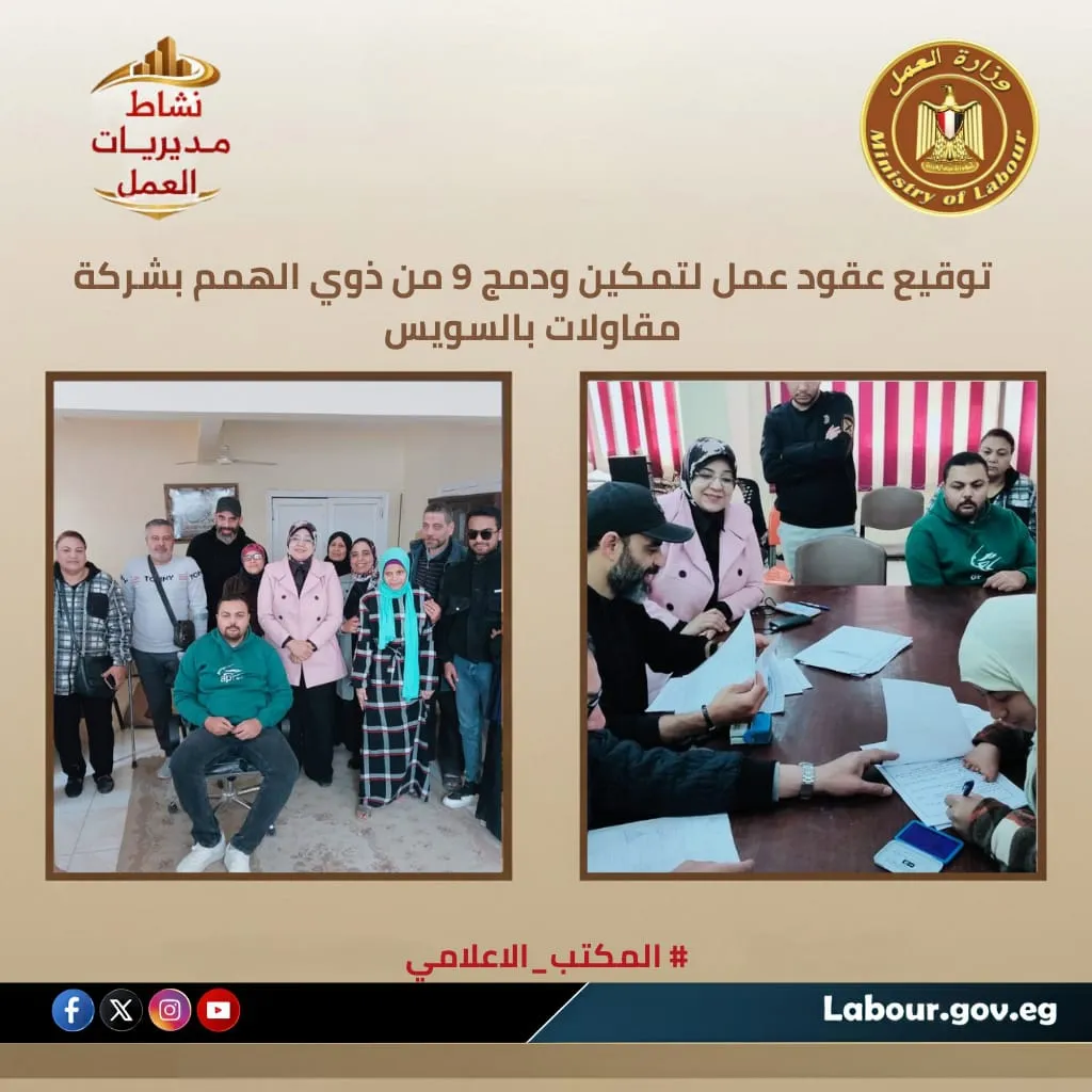 كما نجحت إدارة التشغيل بمديرية عمل السويس، في توقيع عقود عمل واستمارات تأمين لعدد 9 من ذوي الهمم بشركة "إم إس للمقاولات".