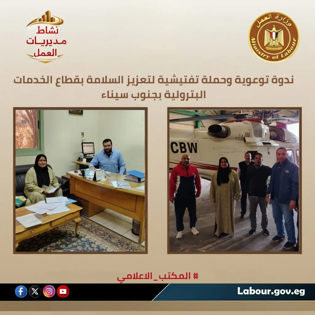 قامت المهندسة نورا الجوهري مفتش مكتب السلامة بأبو رديس، وبإشراف أكرم محمد مدير المديرية والكيميائي عز الدين إبراهيم، بتنفيذ حملة تفتيشية وندوة توعوية بشركات الخدمات البترولية.