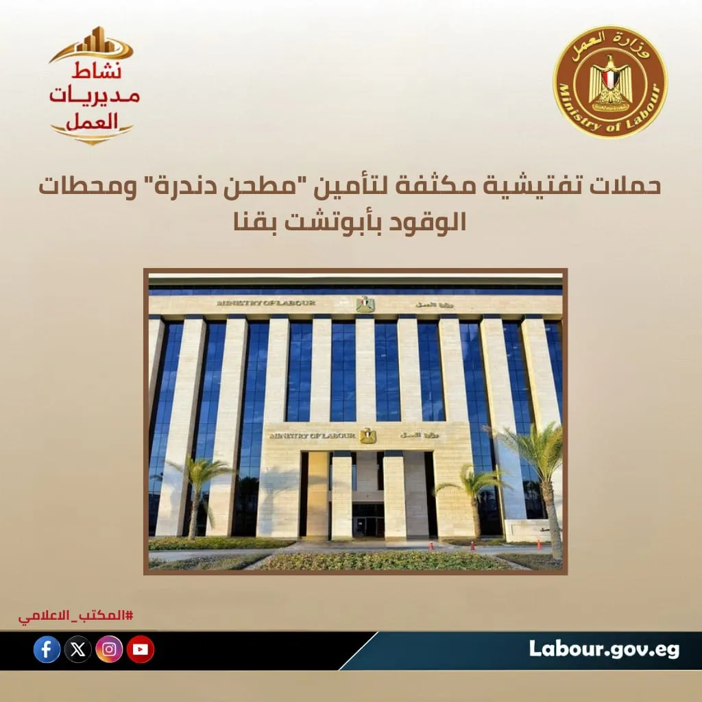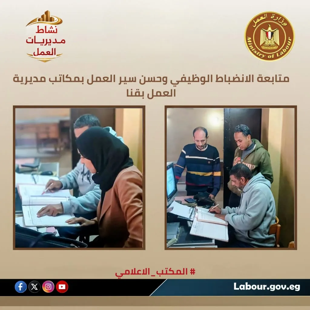 وفي سياق منفصل، نفذت إدارة المراجعة الداخلية والحوكمة في مديرية العمل بقنا برئاسة عزة عبد الله ومشاركة يحيى النوبي جولة تفتيشية لمكاتب (الوقف، التشغيل، وعلاقات العمل).