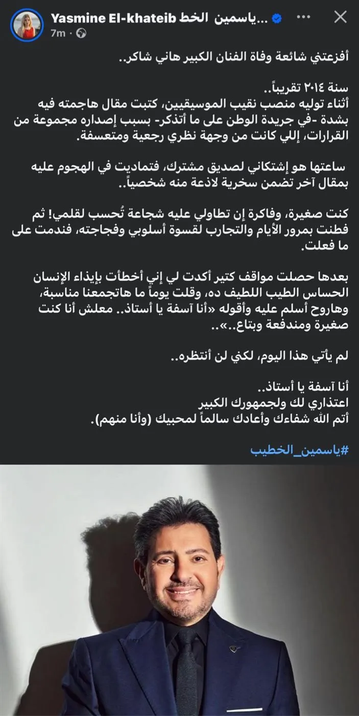 - ياسمين الخطيب تعتذر للفنان هاني شاكر