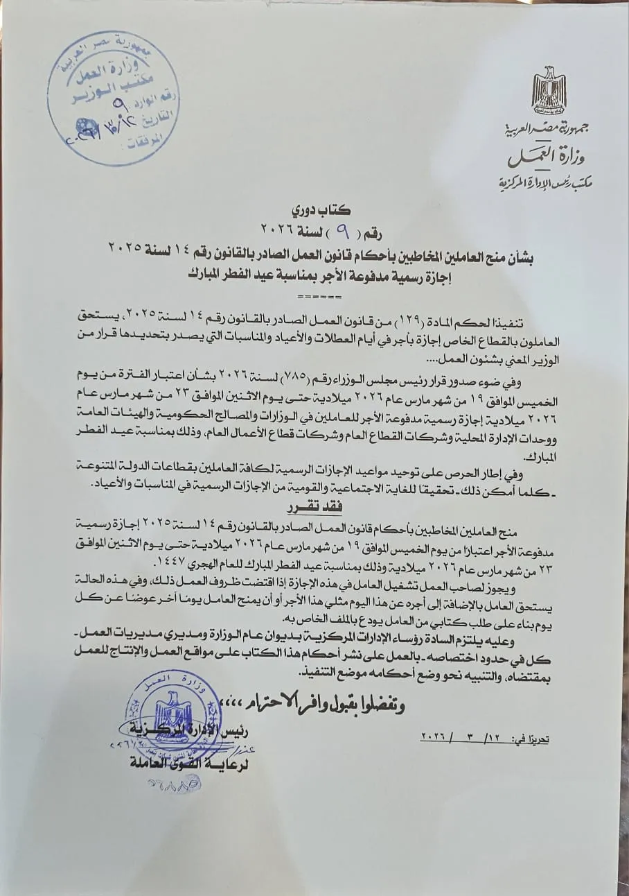 كما يأتي في ضوء صدور قرار رئيس مجلس الوزراء رقم (785) لسنة 2026، والذي تقرر فيه أن تكون الفترة من يوم الخميس الموافق 19 مارس 2026 حتى يوم الاثنين الموافق 23 مارس 2026 إجازة رسمية مدفوعة الأجر للعاملين في الوزارات والمصالح الحكومية والهيئات العامة ووحدات الإدارة المحلية وشركات القطاع العام وشركات قطاع الأعمال العام، وذلك بمناسبة عيد الفطر المبارك.