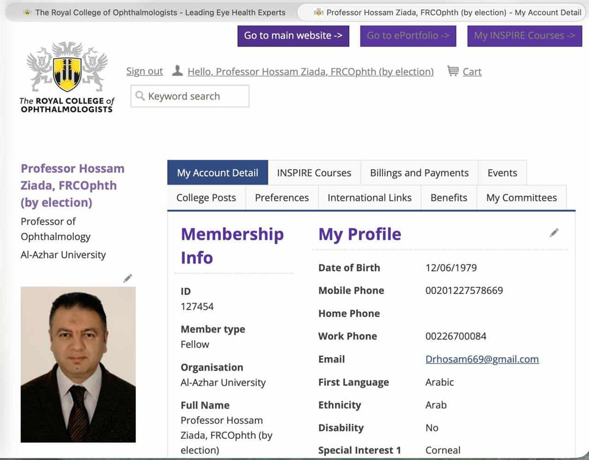 كما حصل الدكتور حسام زيادة على الزمالة الفخرية من كلية جمعية عموم الهند للعيون عام 2023م.