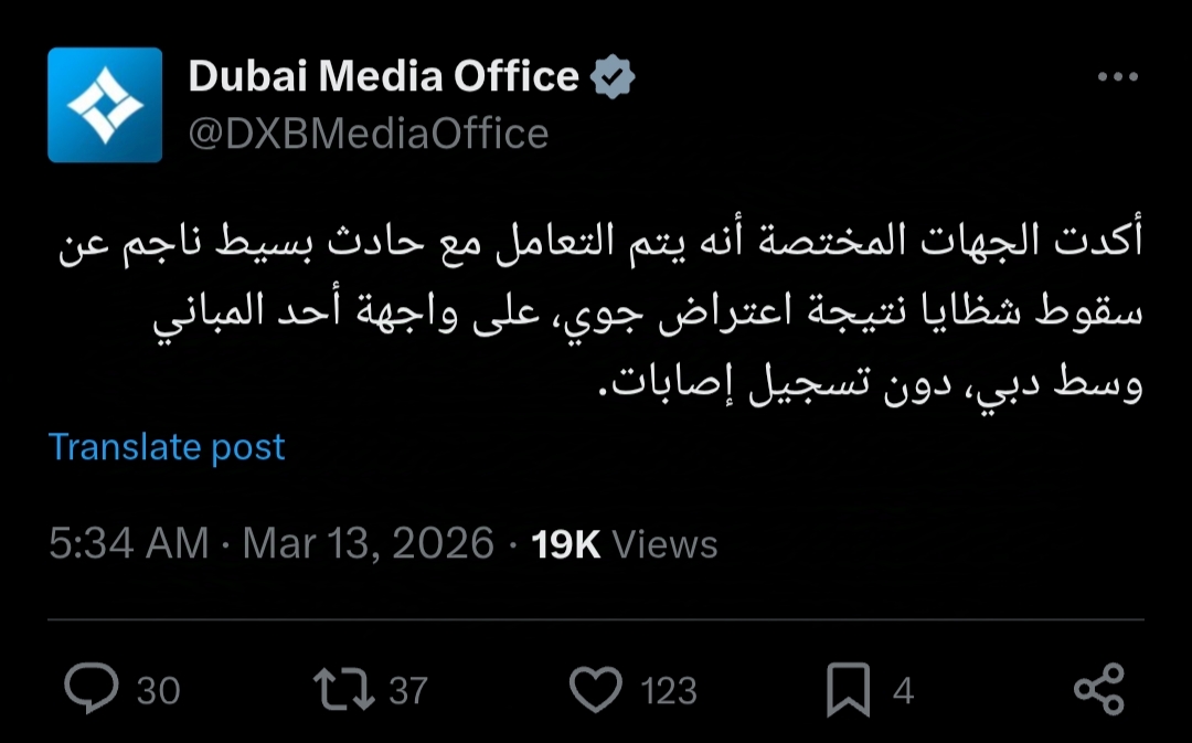 وقال المكتب الإعلامي لحكومة دبي في منشور على حسابه بموقع التواصل الاجتماعي "إكس": "أكدت الجهات المختصة أنه يتم التعامل مع حادث بسيط ناجم عن سقوط شظايا نتيجة اعتراض جوي، على واجهة أحد المباني وسط دبي، دون تسجيل إصابات".