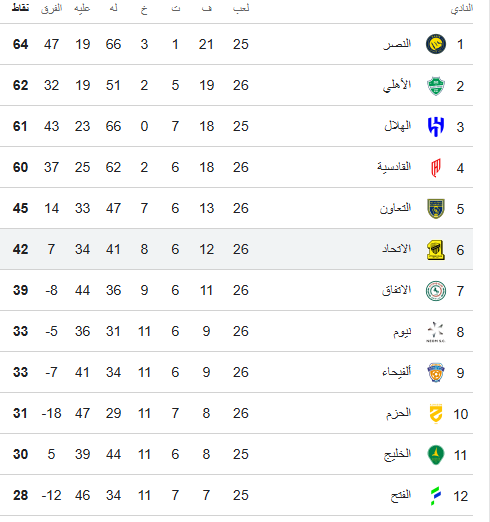 ترتيب دوري روشن السعودي بعد هزيمة الأهلي والاتحاد