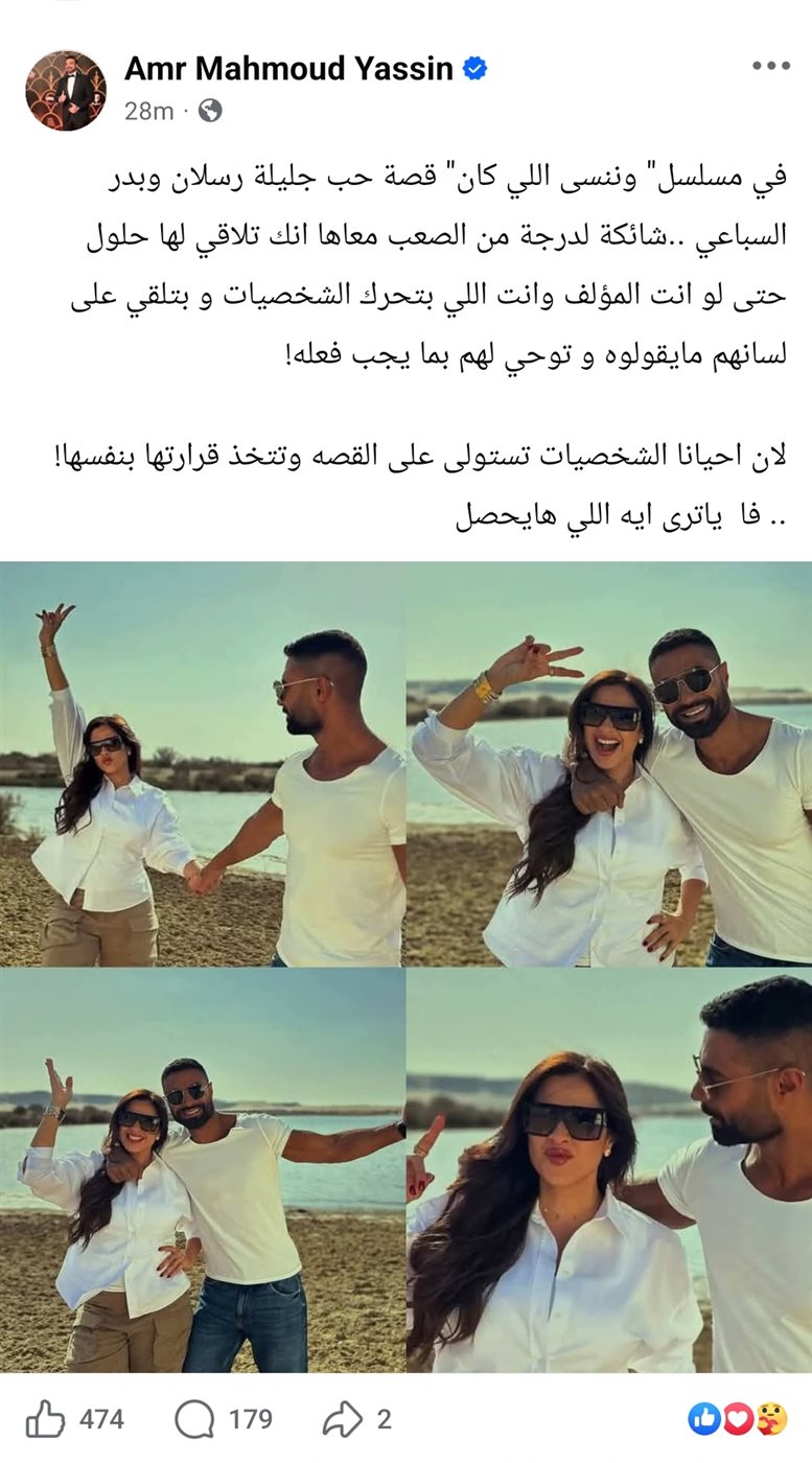 وقال ياسين، عبر حسابه الرسمي على موقع فيسبوك، إن العلاقة بين الشخصيتين أصبحت شائكة للغاية لدرجة يصعب معها إيجاد حلول، حتى بالنسبة له كمؤلف يتحكم في مسار الأحداث ويضع الكلمات على ألسنة الشخصيات.