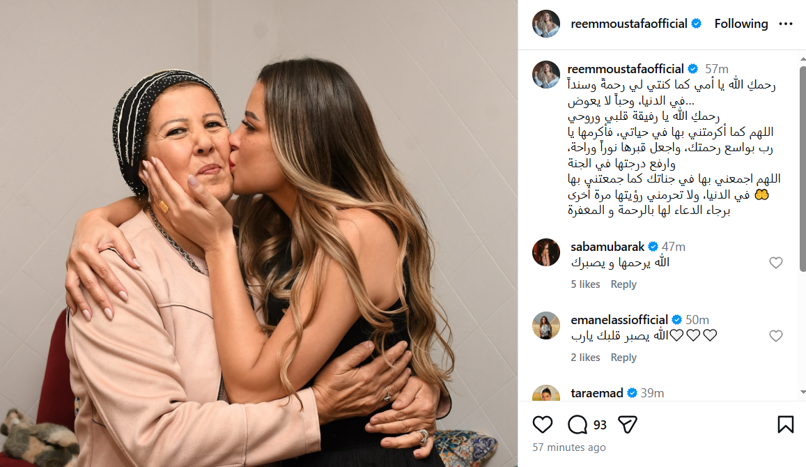 ونشرت ريم مصطفى صورة تجمعها بوالدتها، وكتبت كلمات مليئة بالحزن والدعاء، جاء فيها:«رحمكِ الله يا أمي كما كنتِ لي رحمةً وسندًا في الدنيا، وحبًا لا يعوض… رحمكِ الله يا رفيقة قلبي وروحي. اللهم كما أكرمتني بها في حياتي، فأكرمها يا رب بواسع رحمتك، واجعل قبرها نورًا وراحة، وارفع درجتها في الجنة. اللهم اجمعني بها في جناتك كما جمعتني بها في الدنيا، ولا تحرمني رؤيتها مرة أخرى».