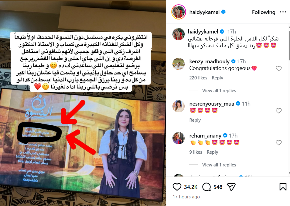 أعلنت البلوجر هايدي كامل عن موافقة الدكتور أشرف زكي نقيب المهن التمثيلية على مشاركتها في مسلسل نون النسوة أمام الفنانة مي كساب، وذلك من خلال منشور شاركته بعد ظهورها في حلقة اليوم، عبر حسابها الشخصي بموقع تبادل الصور والفيديوهات “إنستجرام”.