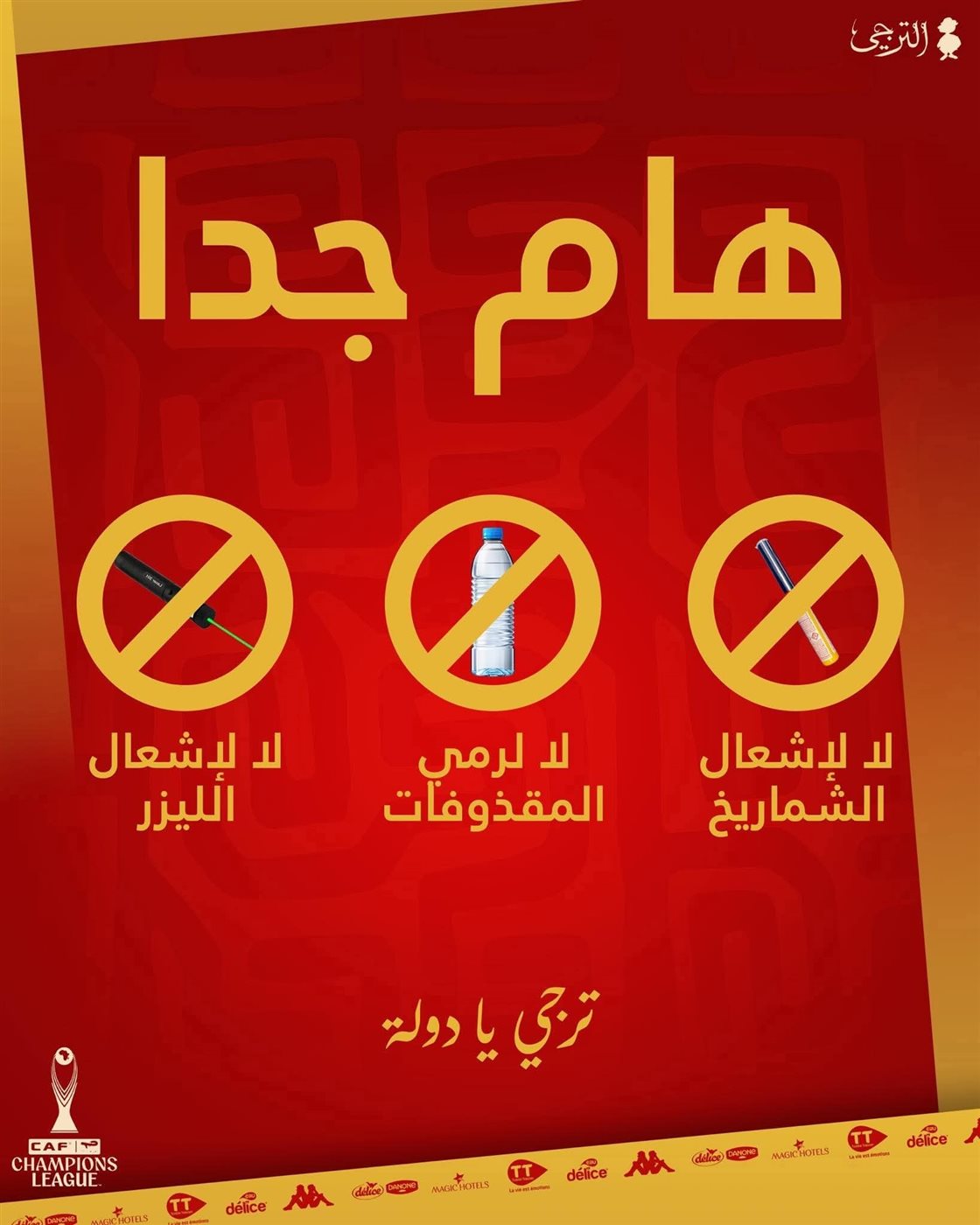 وأكدت إدارة الترجي في بيان رسمي أن جماهير الفريق تُعد أحد أهم عناصر القوة والدعم للاعبين في المباريات الكبرى، مشددة في الوقت نفسه على ضرورة تشجيع الفريق بحماس دون ارتكاب أي تصرفات قد تعرض النادي لعقوبات من قبل الاتحاد الإفريقي لكرة القدم. وأوضح البيان أن النادي يثق في وعي جماهيره الكبيرة وقدرتها على تقديم نموذج حضاري في التشجيع يليق بتاريخ الترجي ومكانته في القارة الإفريقية.