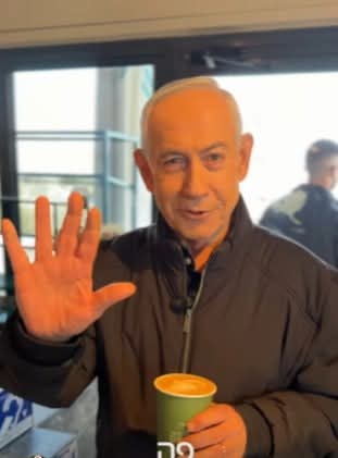 ظهر رئيس الوزراء الإسرائيلي بنيامين نتنياهو للمرة الأولى في مقهى، ليرد على الشائعات التي تداولتها وسائل إعلام عن مقتله، قائلاً بطريقة ساخرة: "أنا ميت… لكن في حب شعبي والقهوة".