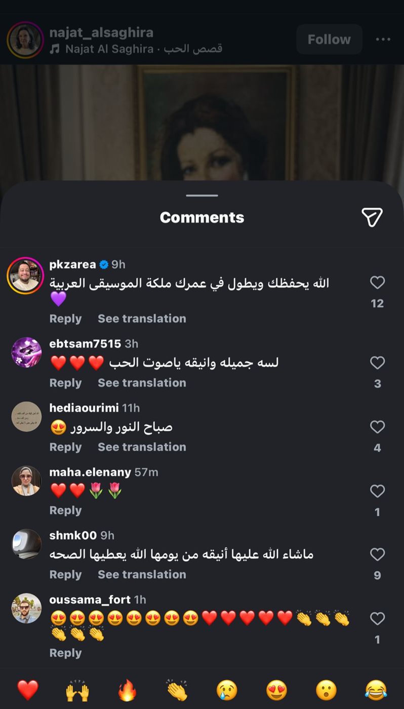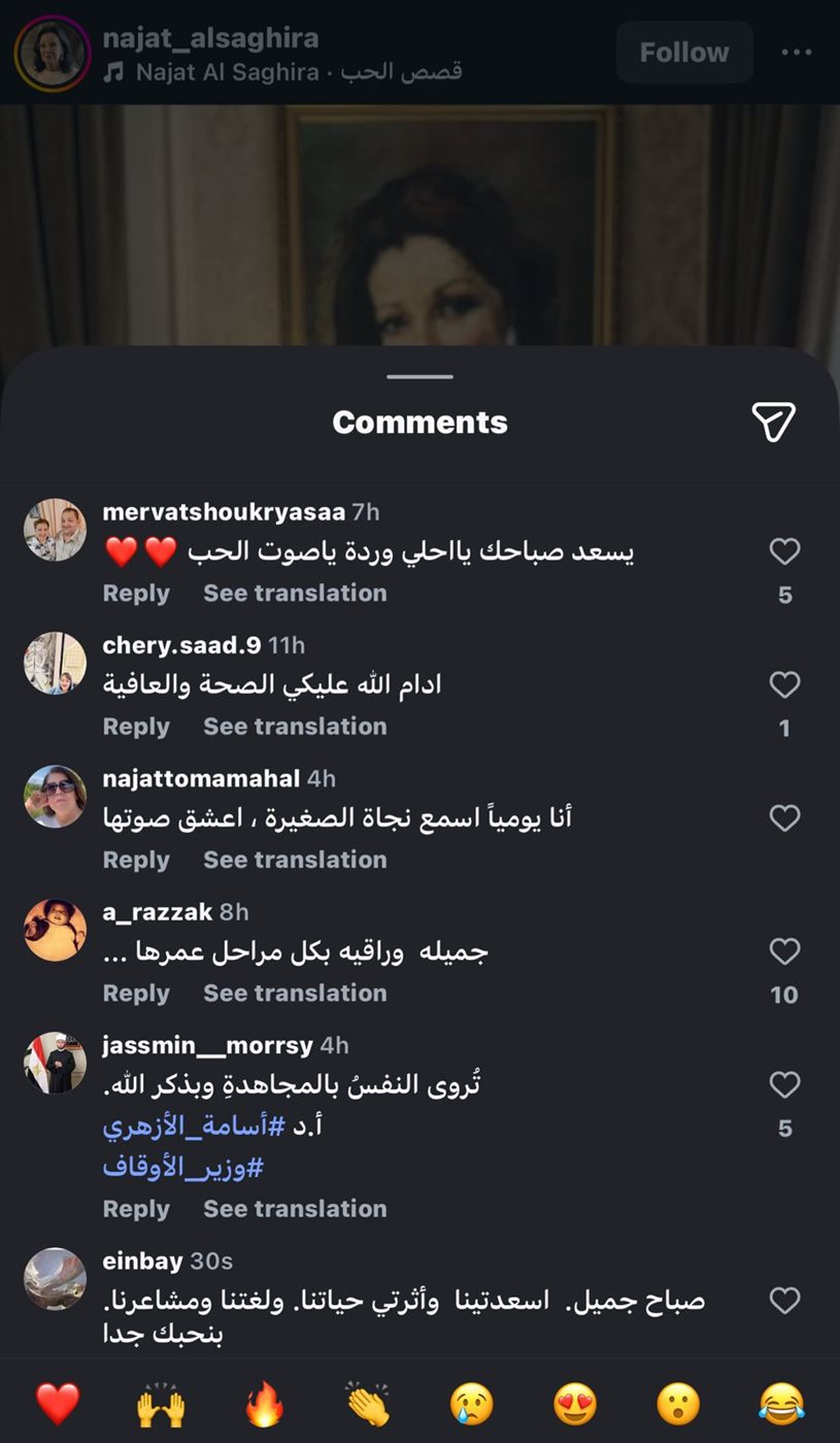 انهالت تعليقات رواد مواقع التواصل الإجتماعي على صور نجاة الصغيرة، مؤكدين أنها لا زالت جميلة وأنيقة، وراقية بكل مراحل عمرها، وكانت أبرزها: “أسعدتينا وأثرتي حياتنا، أحلى وردة ياصوت الحب، ماشاءالله أنيقة من يومها الله يعطيها الصحة”.
