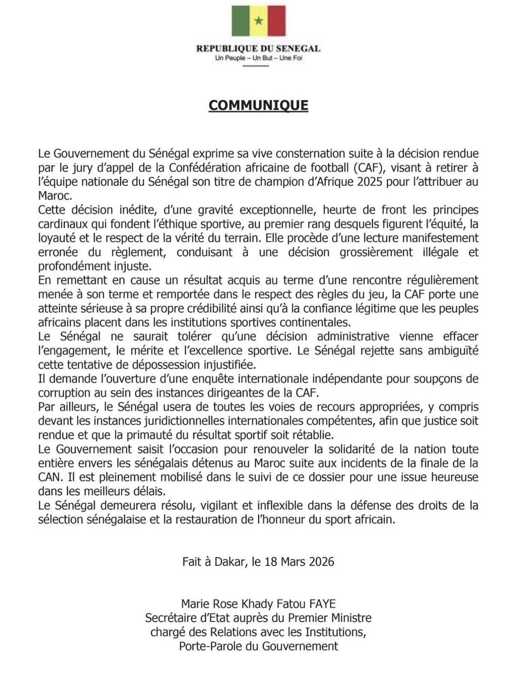 وأصدرت الحكومة السنغالية بيانًا رسميًا اليوم الأربعاء موقعًا من المتحدثة الرسمية، قالت خلاله: تعرب حكومة السنغال عن استيائها الشديد إزاء قرار لجنة الاستئناف التابعة للاتحاد الإفريقي لكرة القدم، بسحب لقب كأس الأمم الأفريقية 2025 من المنتخب السنغالي ومنحه للمغرب.