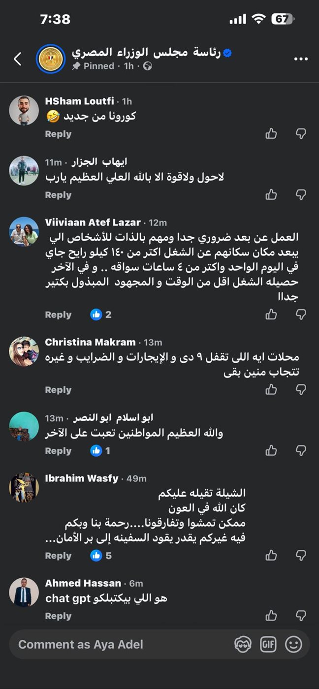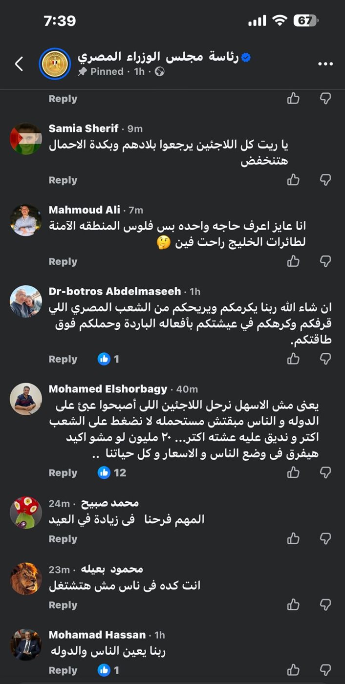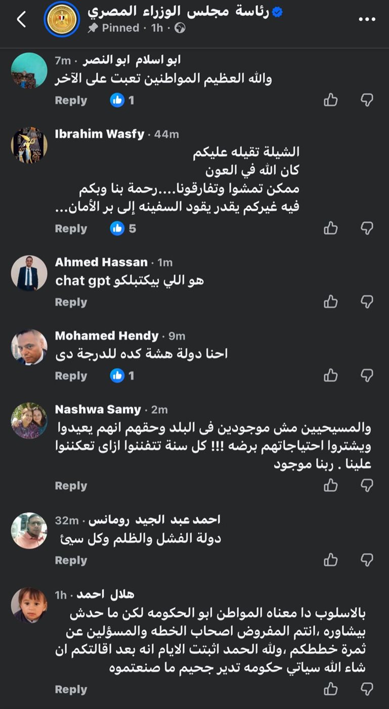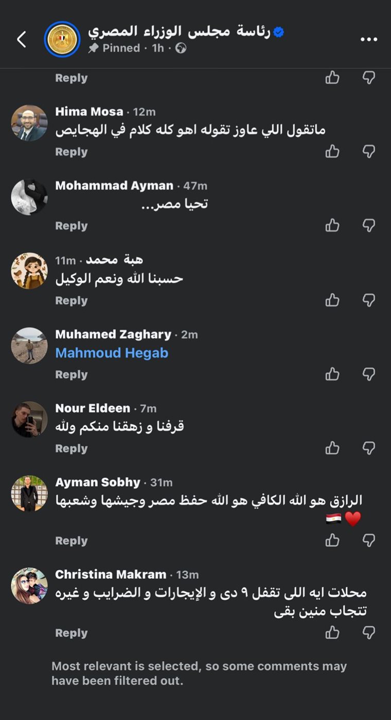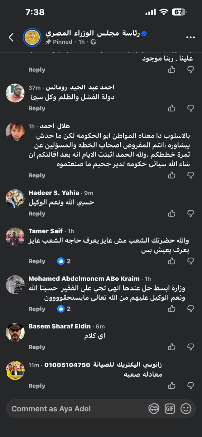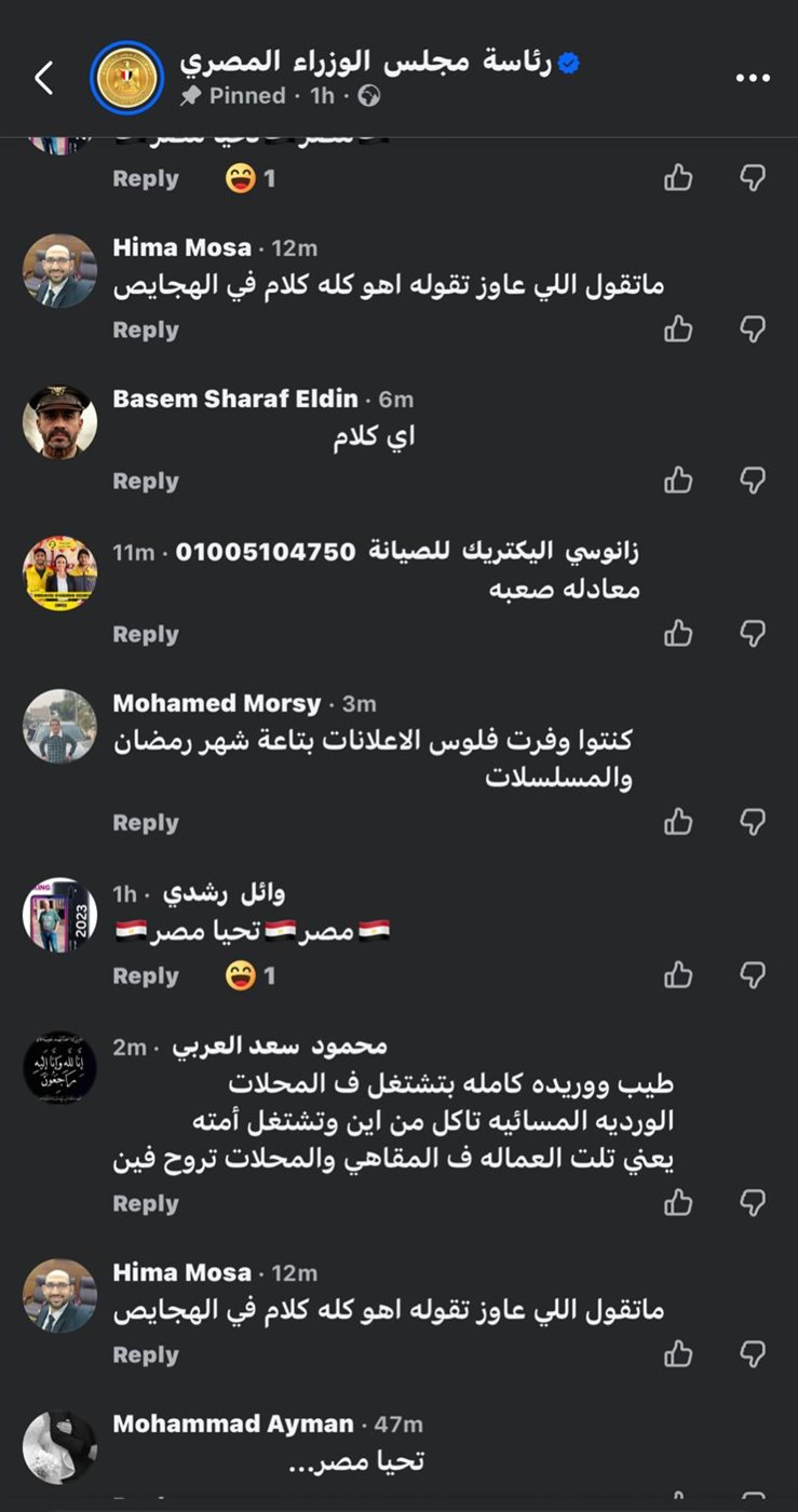 وكانت أبرز التعليقات: “ان شاء الله ربنا يكرمكم ويريحكم من الشعب المصري .. المواطنين تعبت على الآخر، الشيلة تقيلة عليكم امشوا وفارقونا رحمة بينا وبكم في غيركم يقدر يقود السفينة إلى بر الأمان .. دول الظلم والفشل وكل سيء .. حسبنا الله ونعم الوكيل … وزارة ابسط حل عندها انها تيجي على الفقير معادلة صعبة .. الشعب عايز يعرف يعيش .. كنتوا وفرتوا فلوس اعلانات ومسلسلات رمضان”.
