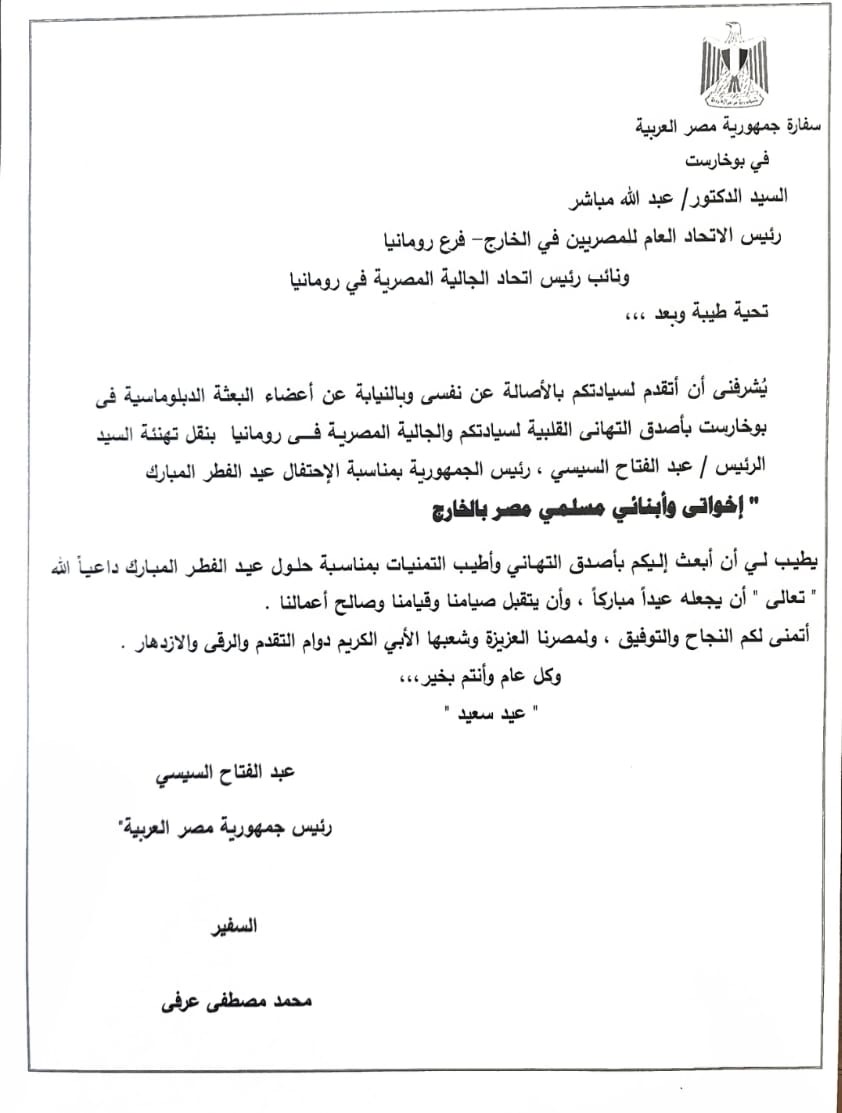 وقال السفير محمد مصطفى عرفي: “ اتشرف بأن أنقل وارسل لأعضاء الجالية المصرية المسلمة في رومانيا”.